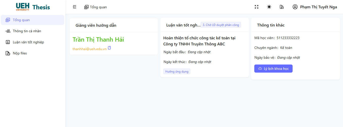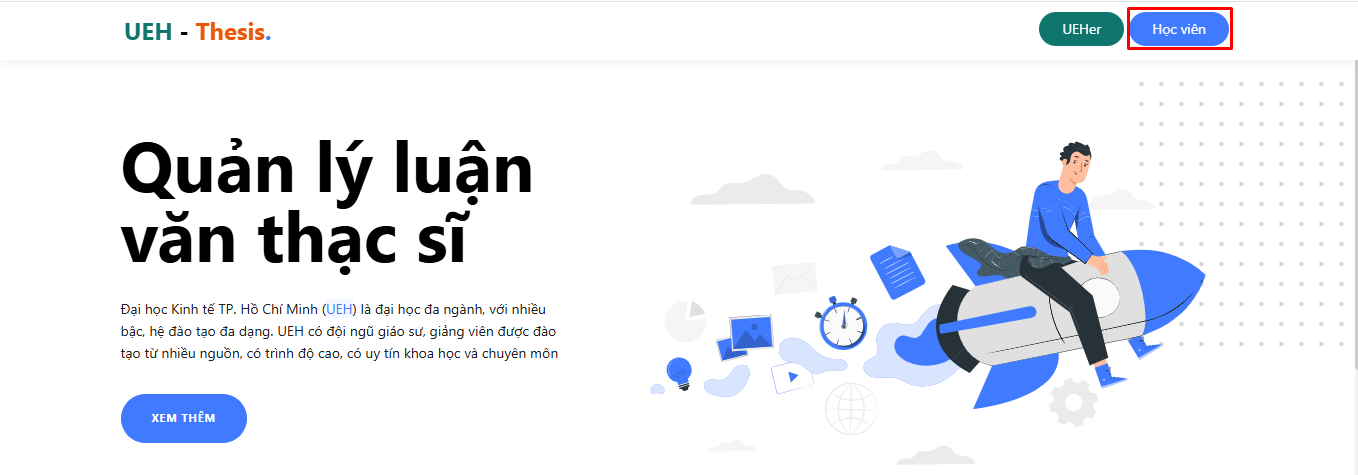 Bước 4: Sau khi đăng nhập thành công, hệ thống hiển thị các tính năng dành cho tài khoản học viên cao học