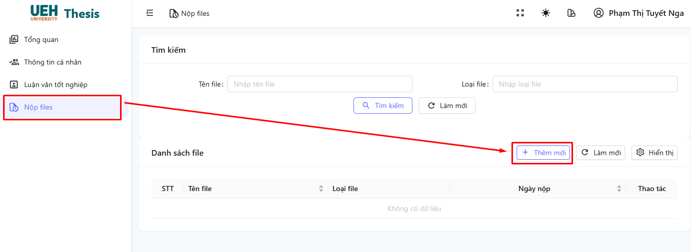 - Điều hướng đến mục Nộp files trong trang Thông Tin Luận Văn.