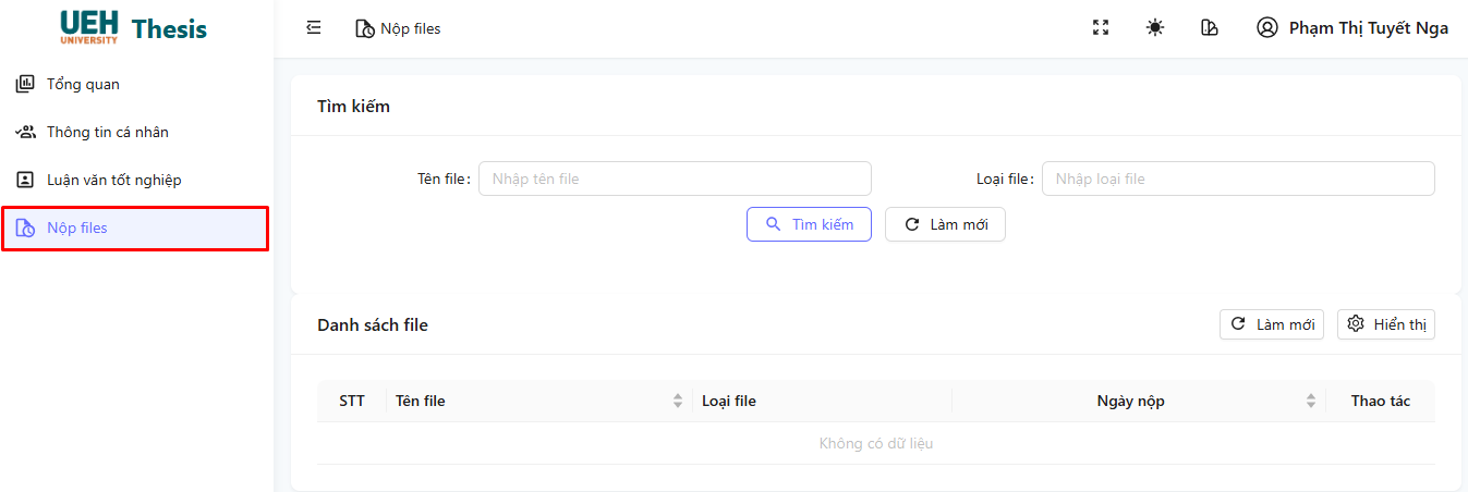 - Chọn mục Nộp Files từ menu cá nhân hoặc trong trang Thông Tin Luận Văn.