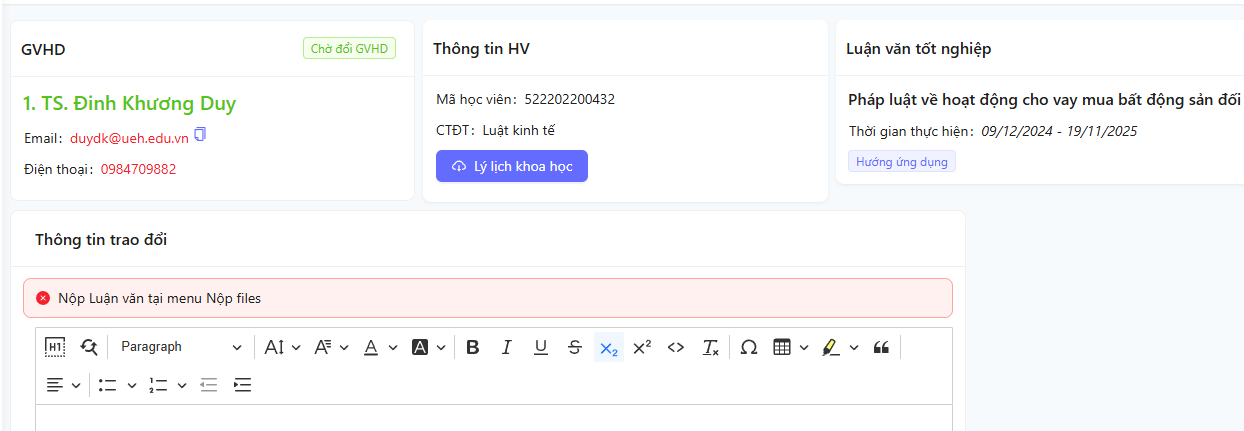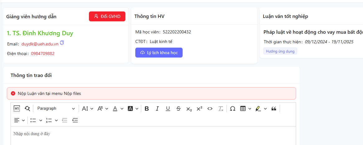 - Cho phép học viên cao học thực hiện yêu cầu thay đổi giảng viên hướng dẫn trực tiếp trên hệ thống trong các trường hợp cần thiết (ví dụ: giảng viên bận công tác, học viên muốn chuyển hướng nghiên cứu...), đảm bảo quy trình minh bạch, có sự đồng thuận và quản lý chặt chẽ từ khoa/phòng đào tạo.