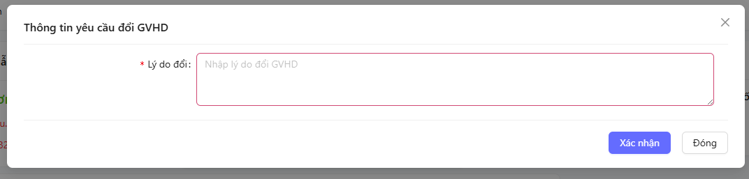để thực hiện yêu cầu đổi GVHD. Anh/chị nhập lý do đổi sau đó chọn Xác nhận để gửi yêu cầu đổi GVHD